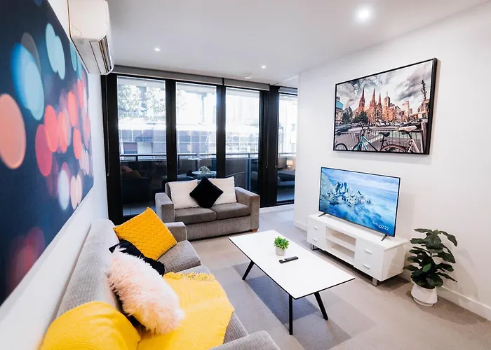 Cozy Spacious Holiday 2B2B Melbourne Cbd Apartment offers a balcony, a living room, and a fully equipped kitchen, as well as comforts like air conditioning and a washing machine.